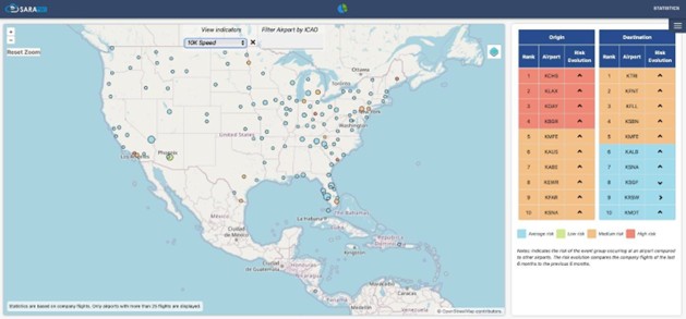 (Below) You will have the ability to see the risk of a specific event in a system-wide airport format. In this screenshot example, descending below 10,000 ft at speeds greater than 250 knots has shown highest risk at CHS, LAX, DAY, and BGR.