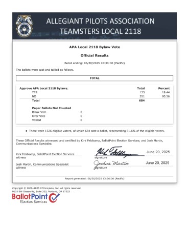 Both the bylaws and leadership appointments mark a turning point in the Allegiant Air pilots reclaiming their Union. Even still, our fight for a fair contract, as well as our efforts to defend our current one, are ongoing. Management’s delay tactics during bargaining, their unilateral changes to rules and working conditions, and their support of a decertification/ALPA drive have no chance against a unified pilot group, led by competent and dedicated pilots willing to do the work. If you wish to be a part of this transition and understand the incredible time commitment and sacrifice required to hold a Union position, please send your resume to gunterseher@apa2118.org. Pilots with professional communications, administration, and leadership skills are welcome to apply.