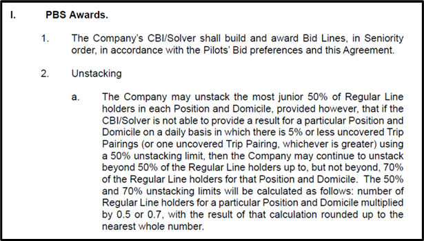 Unlike the rest of the industry which places hard limits on who cannot be unstacked (70% in normal months, 50% in holiday months), the Allegiant language says who can be unstacked. At least 70% of the pilots can have their preferences ignored every month, and in some cases beyond 80% thanks to a rounding clause does not present anywhere else in the industry. Every airline offers explicit and reasonable limits to protect seniority, Allegiant does not. Why?